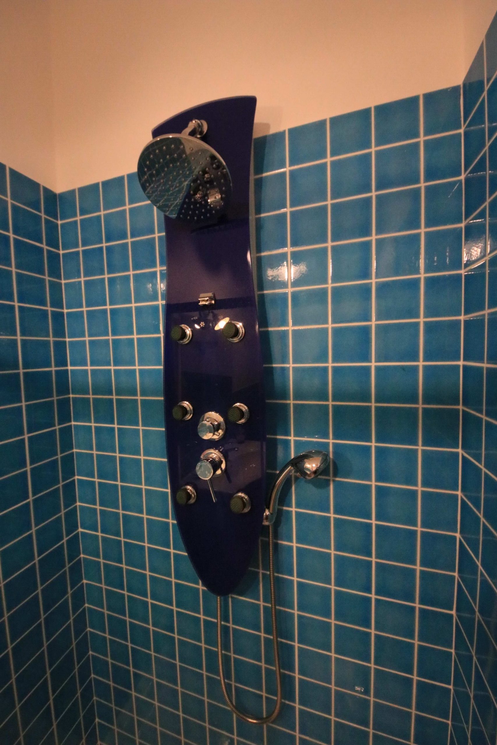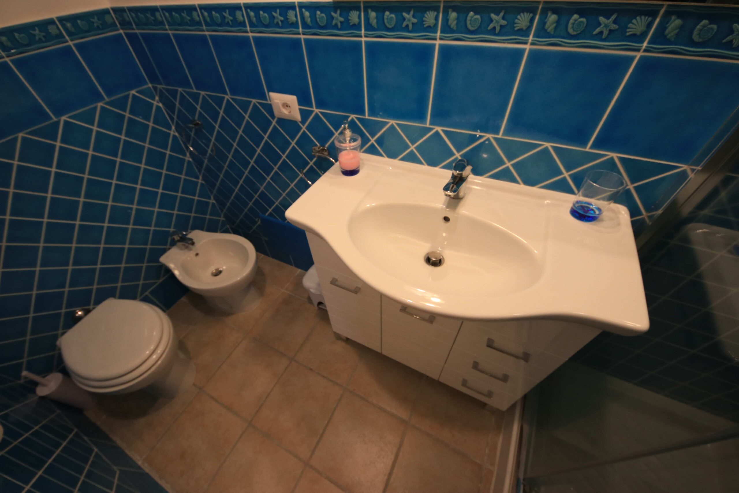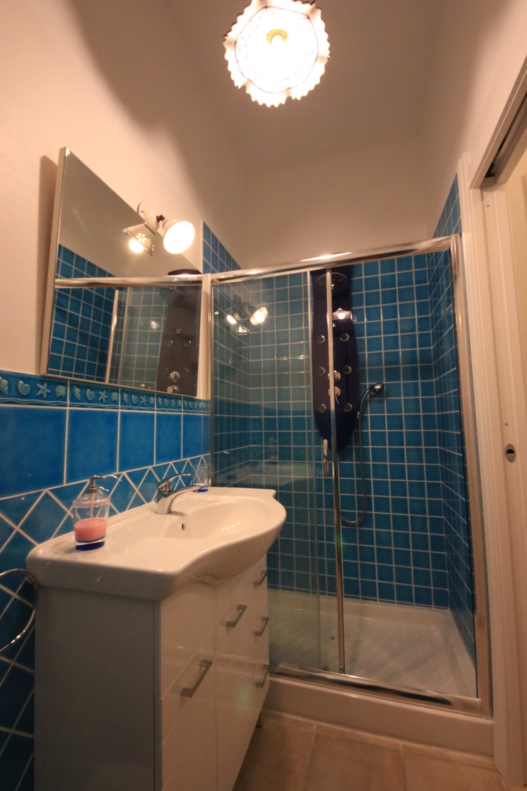 El baño está decorado con finos azulejos de cera azul de Cerdeña con motivos marinos. Cuenta con una amplia ducha de hidromasaje, lavabo, inodoro y bidé. Se proporciona secador de pelo y jabones de cortesía.