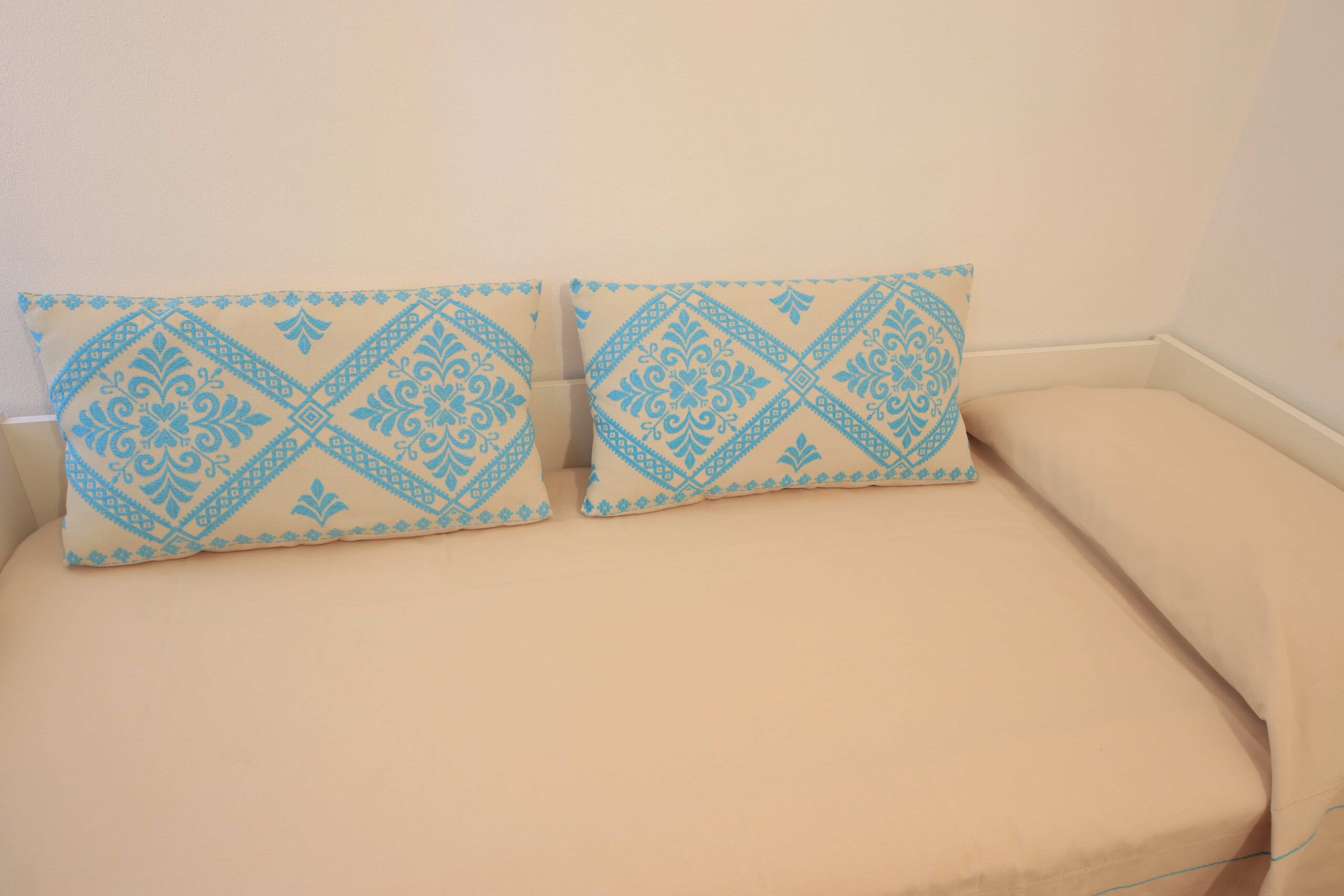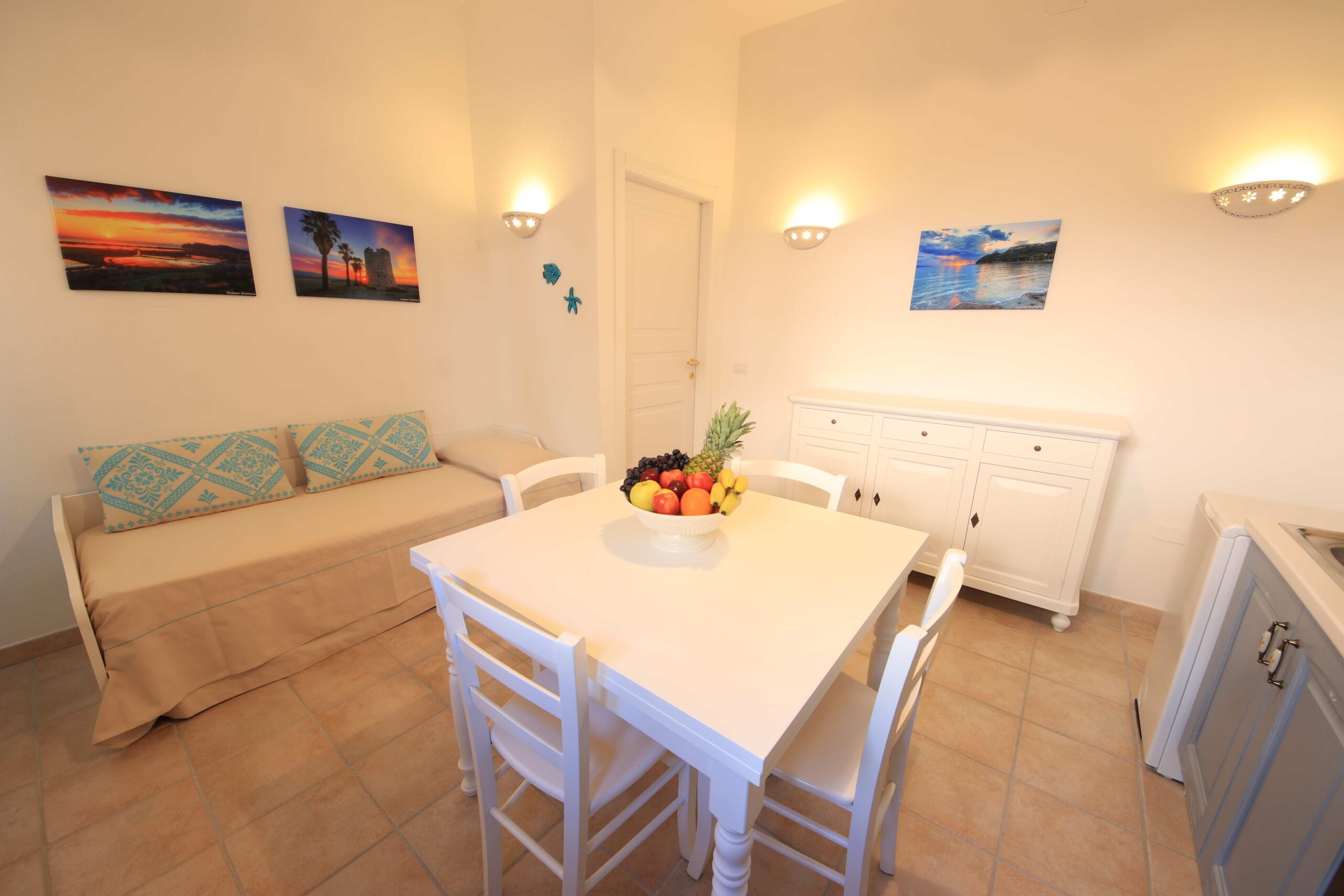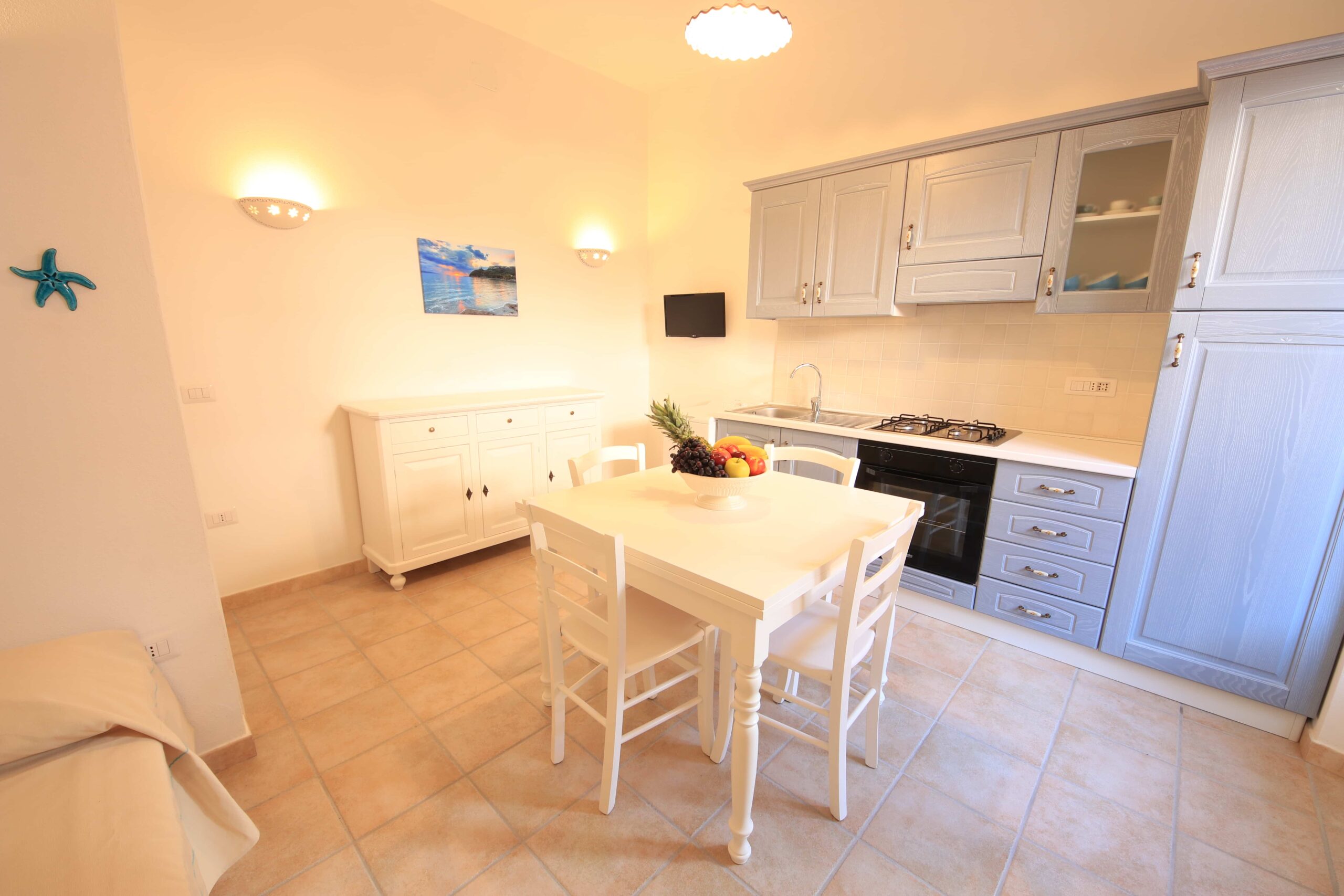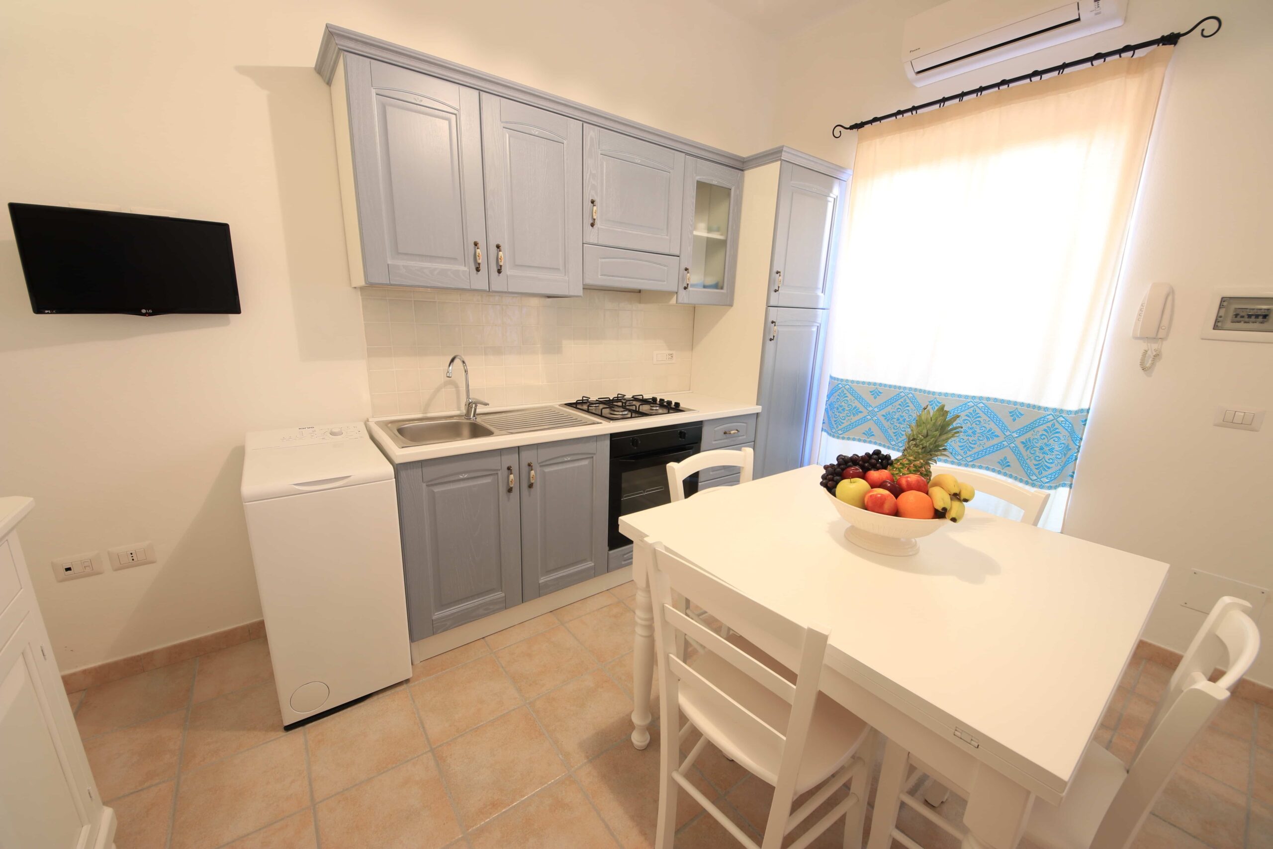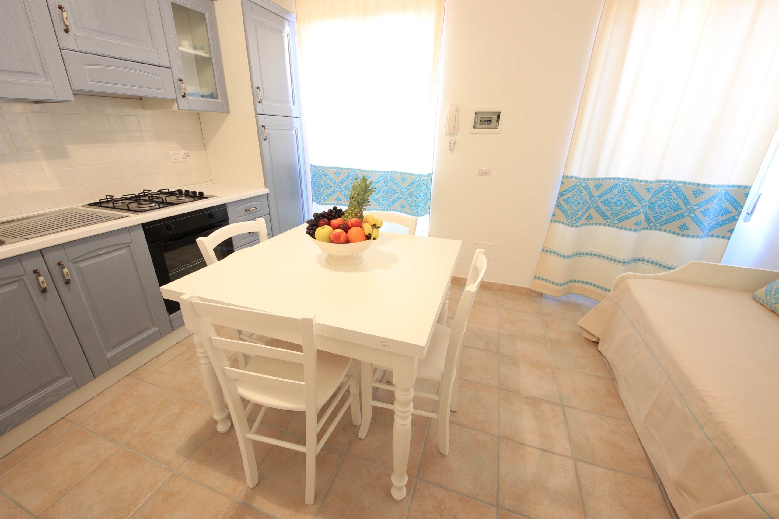 El apartamento ha sido recientemente renovado y amueblado en estilo sardo con cortinas, tapices y colchas azules a juego.
