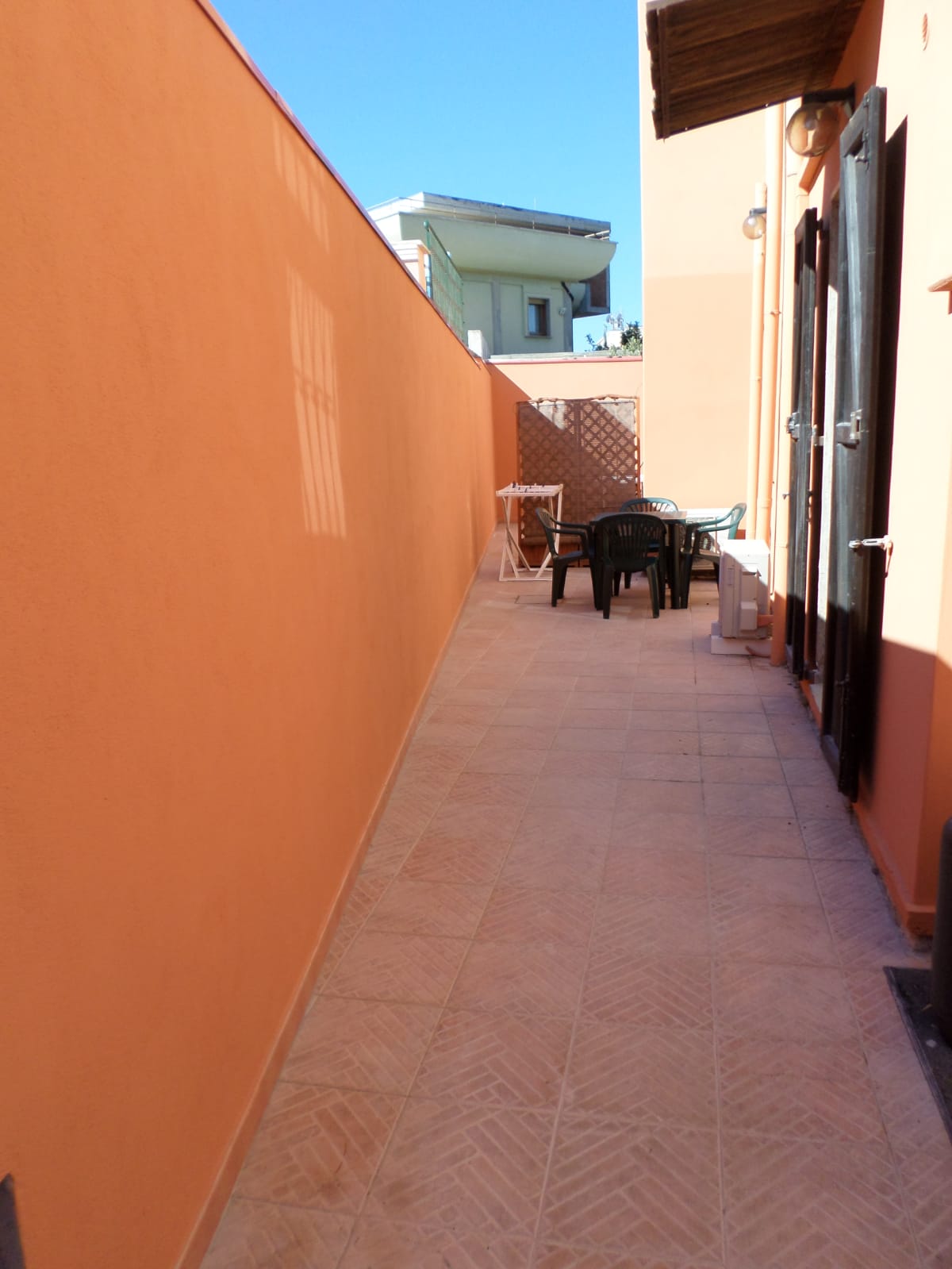 Patio exterior embaldosado con mesa y sillas.