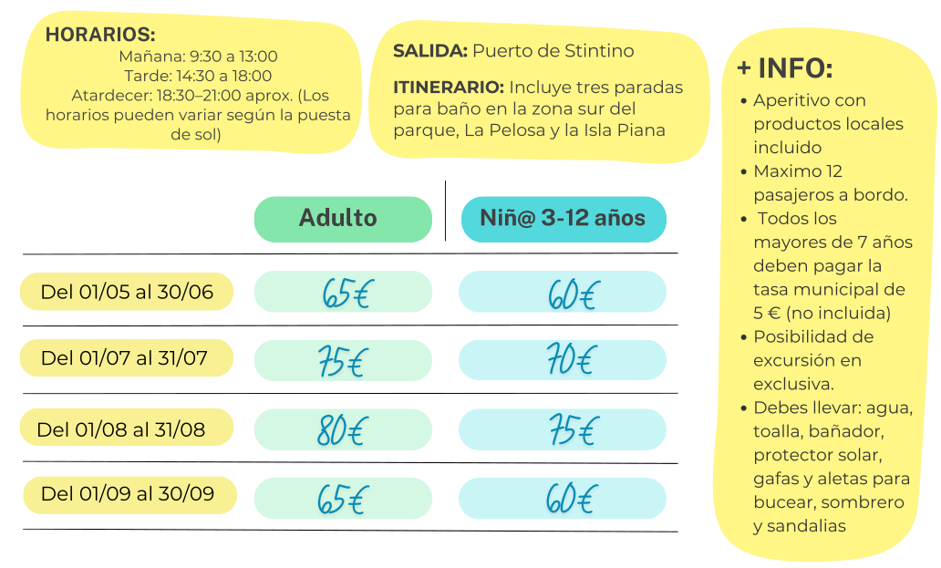 El precio de la excursión no incluye la tasa municipal de desembarco en la isla de Asinara, que se pagará en efectivo al embarcar. De junio a septiembre son 5 € por persona a partir de 7 años. Niños menores de 6 años no pagan.