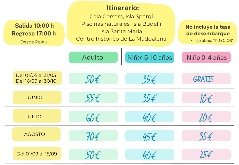 Visitarás el archipiélago de La Maddalena, un magnífico parque nacional compuesto por diferente islas: la isla de la Maddalena, isla de Spargi, isla de Budelli, isla de Santa María… Vive con nosotros una experiencia inolvidable al mejor precio con salidas desde Palau y desde la Maddalena.