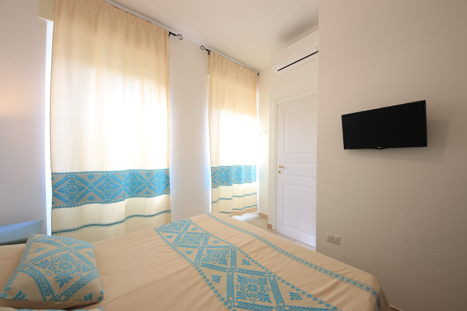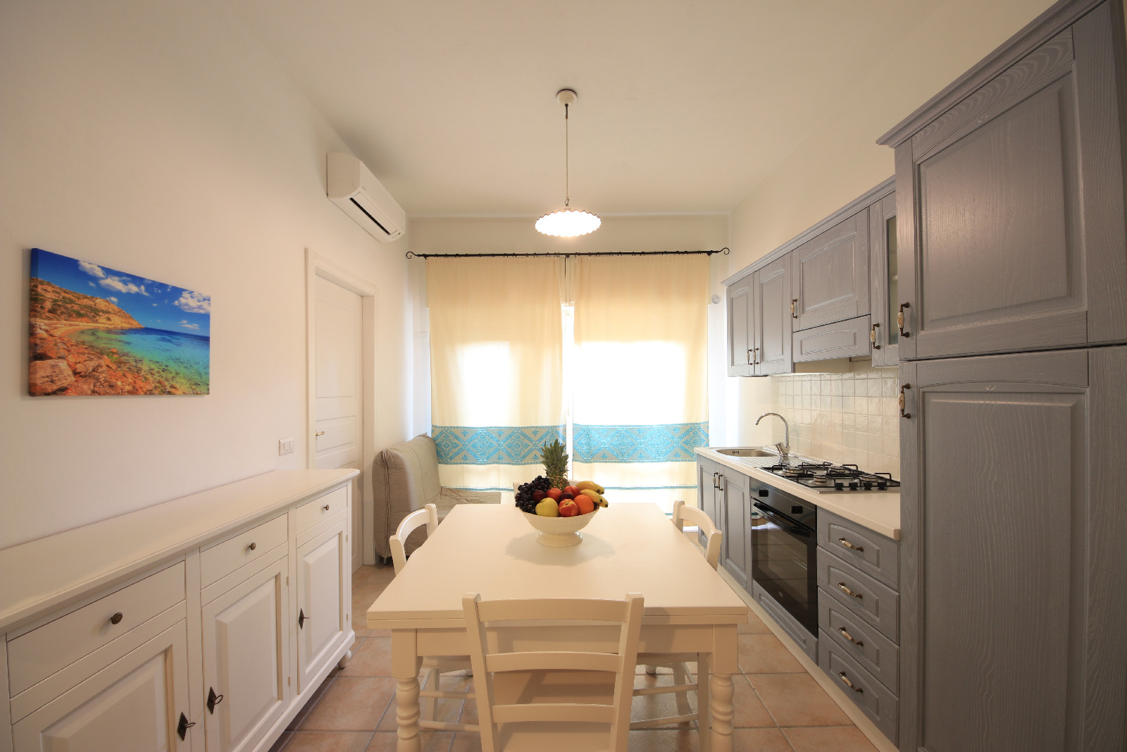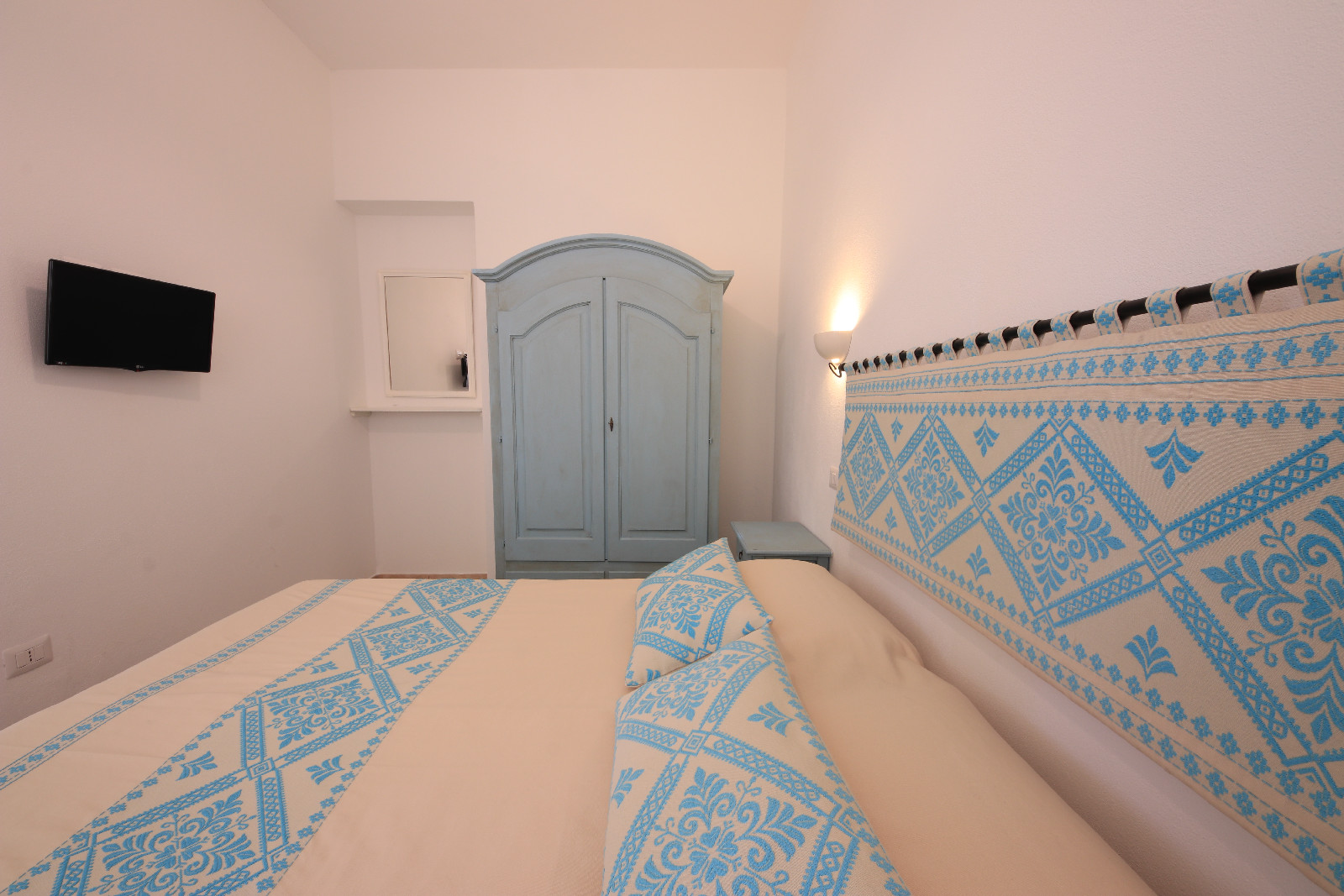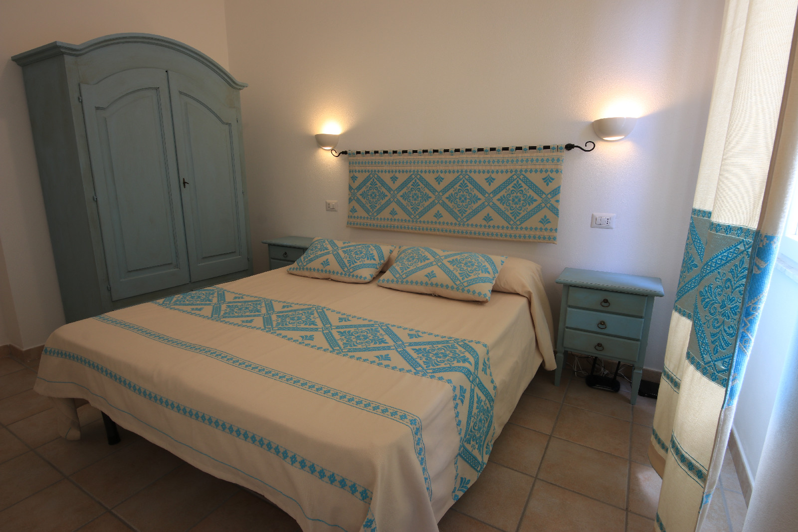 El apartamento ha sido recientemente renovado y amueblado en estilo sardo con cortinas, tapices y colchas azules a juego.