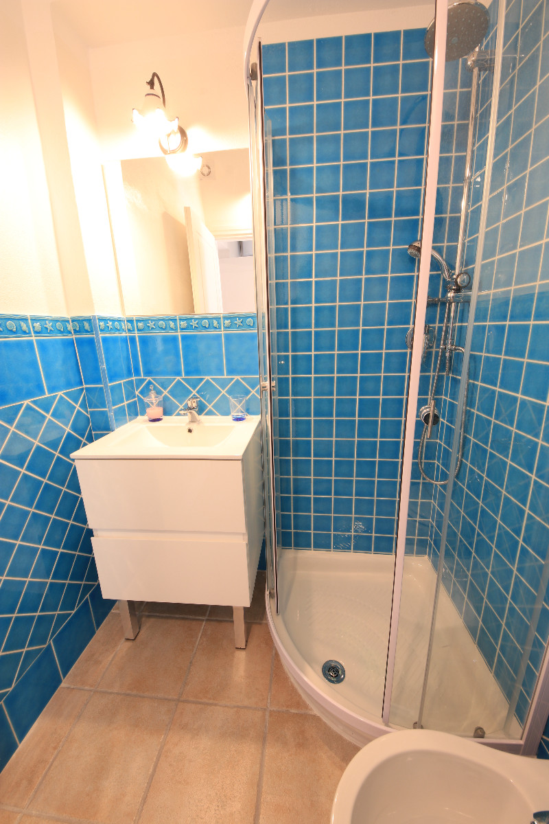El baño está decorado con finos azulejos de cera azul de Cerdeña con motivos marinos. La ducha es cómoda y espaciosa. Incluye lavabo, inodoro y bidé. Se proporciona secador de pelo y jabones de cortesía.