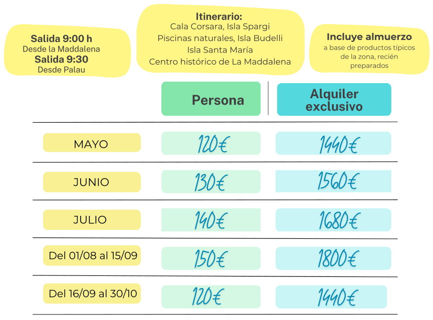 Las salidas se realizan todos los días desde el puerto de La Maddalena, a las 9:00 horas, y desde el puerto de Palau a las 9:30 horas.