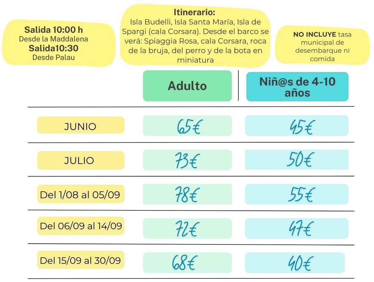 El precio no incluye la tasa municipal de desembarco, que se deberá abonar en efectivo en el momento de embarcar. El coste por persona a partir de 7 años es de 2,50€ para los meses de mayo, septiembre y octubre y de 5€ en junio, julio y agosto.